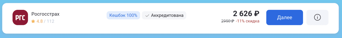 На сайте Росгосстрах ипотечная страховка стоит 3 300 ₽. Через Полис812 можно оформить тот же полис со скидкой 11%, всего за 2 626 ₽.