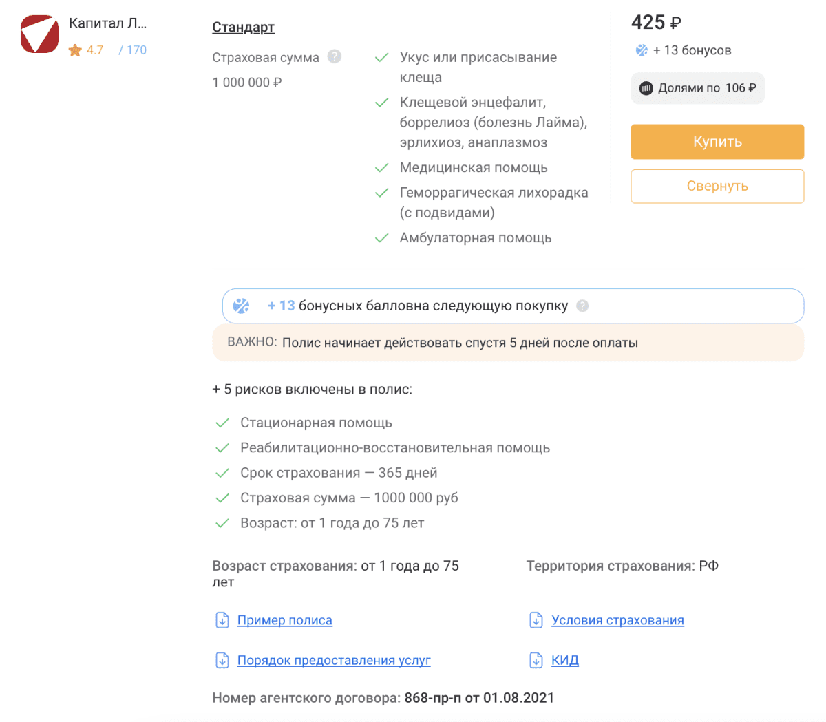 Стоимость страховки — от 425 ₽ в год.