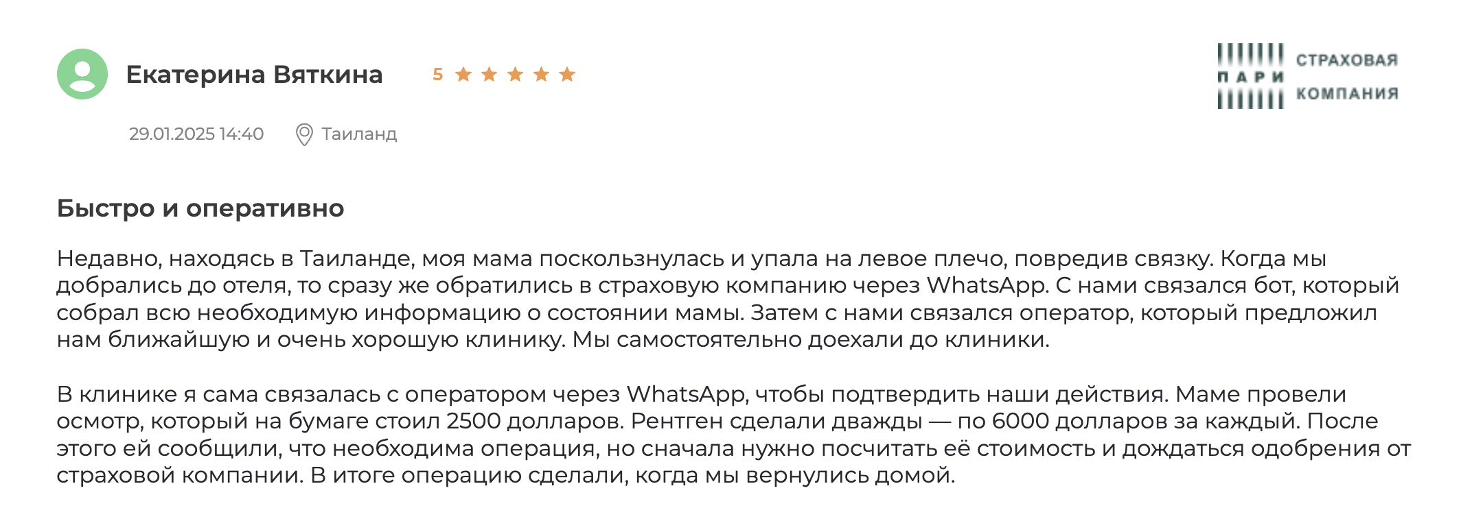 Моя мама поскользнулась в Таиланде и сильно ушибла левое плечо, повредив связку. Мы сразу поняли, что нужна медицинская помощь. Сразу после этого написали в страховую через WhatsApp.