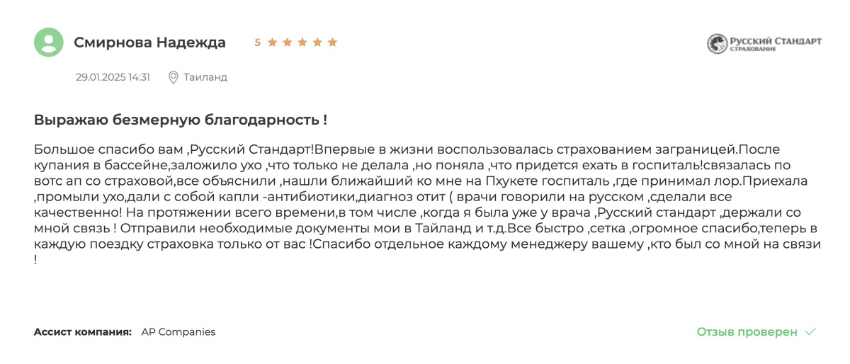 Теперь я точно знаю: если случится страховой случай с отитом или другой проблемой за границей, страховка «Русский Стандарт» не подведет.