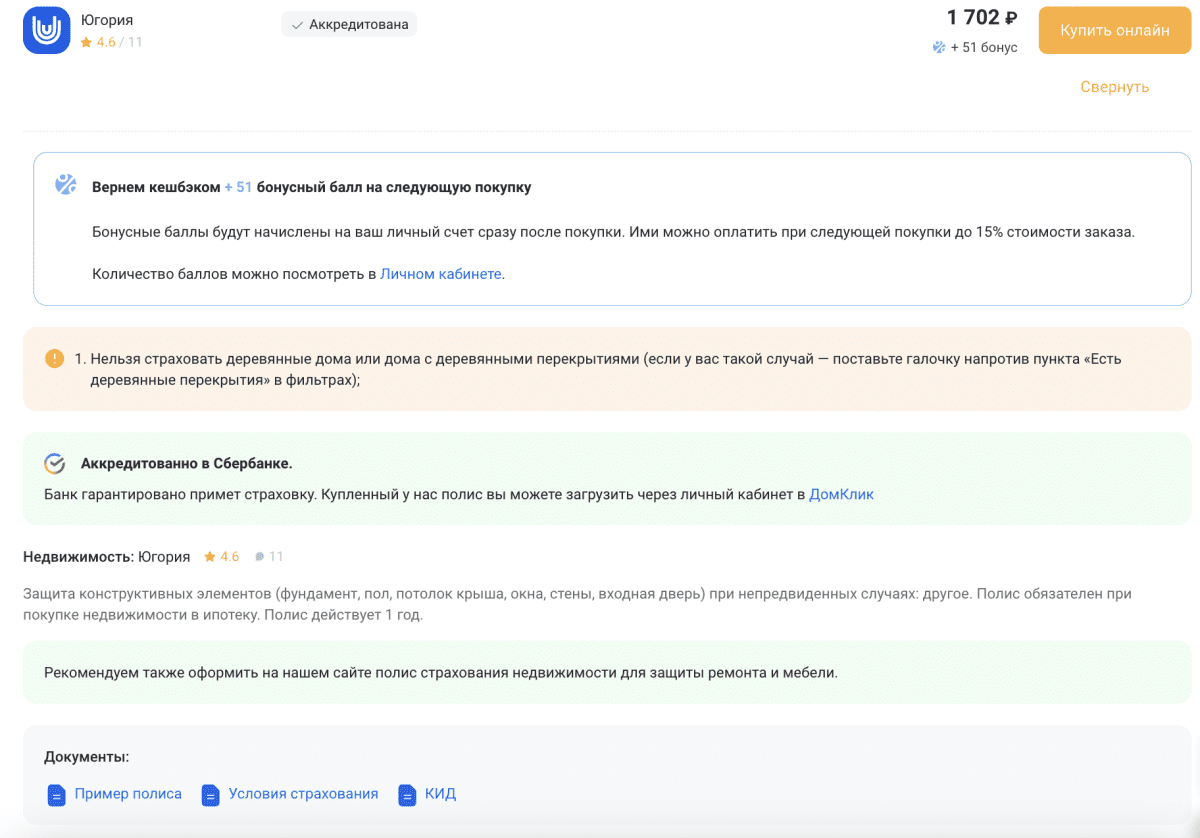 Затем смотрим результаты выдачи по указанным параметрам. У каждой программы указано, аккредитована ли компания Сбербанком. Но вы можете самостоятельно проверить список аккредитованных страховщиков для недвижимости.
