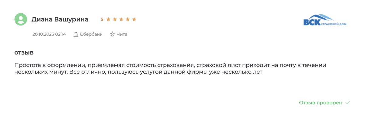 «Страховой лист приходит на почту в течение нескольких минут. Всё отлично, пользуюсь услугой данной фирмы уже несколько лет.»