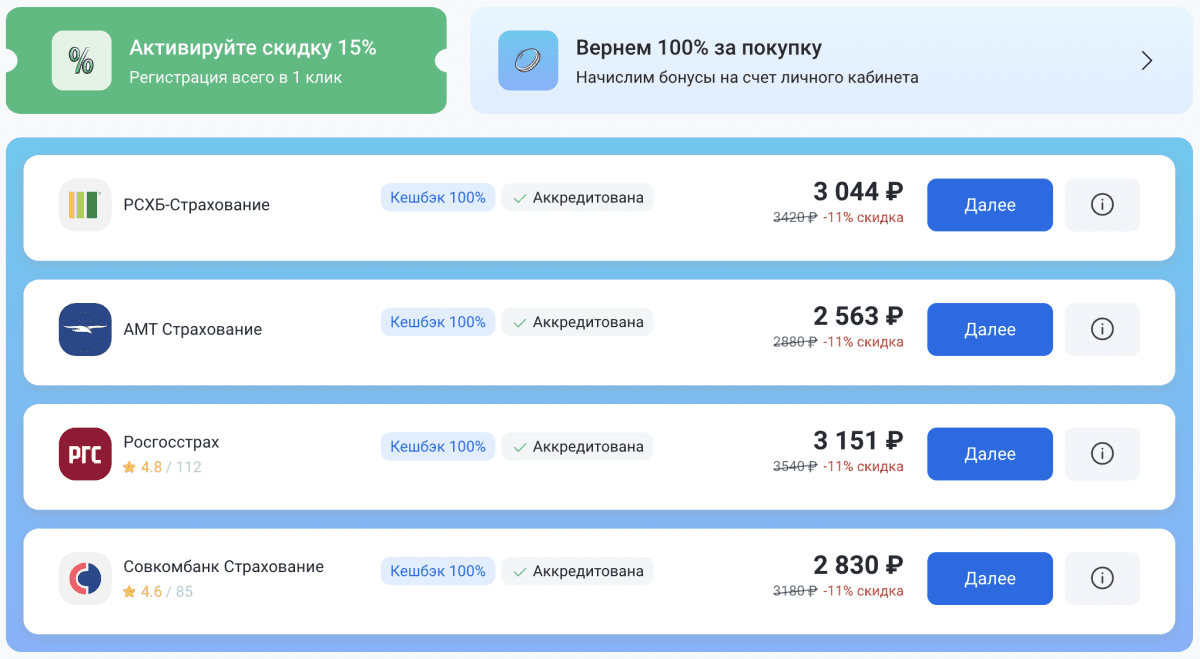 Росгосстрах | ⭐ 4.8 | Кешбэк 100 % | 3 151 ₽ | −11 % | Аккредитована | |