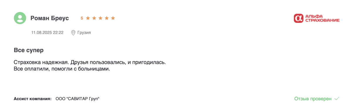 | АльфаСтрахование | 796 ₽ | Купить | Полис с возможностью продления, покрытие хронических заболеваний, срочная помощь |