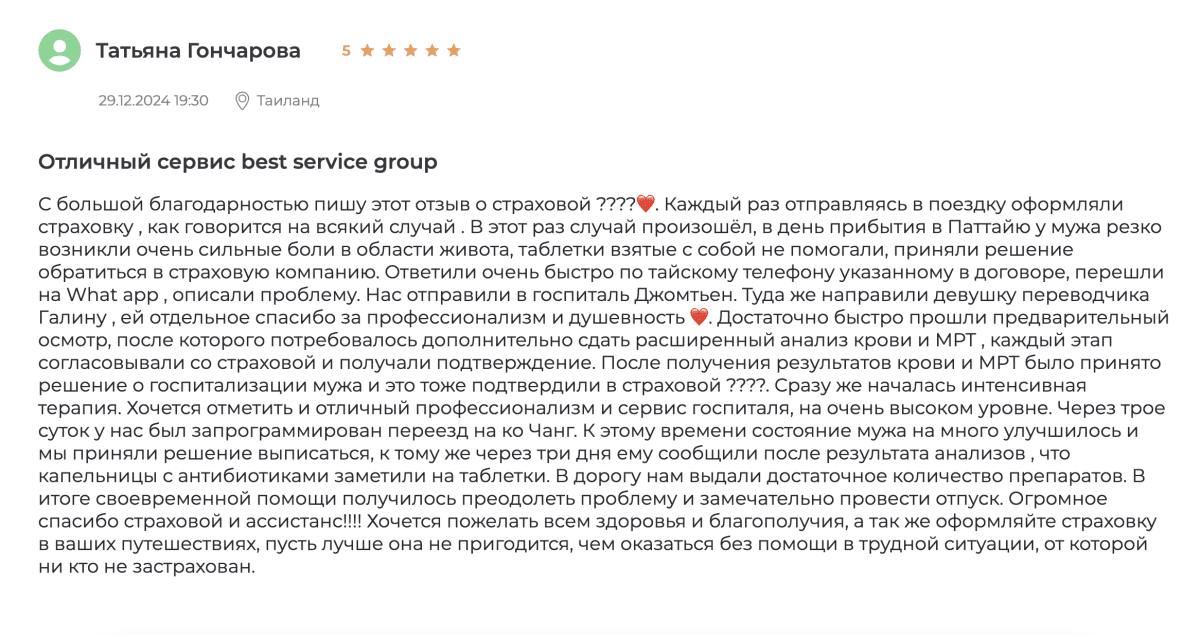Благодаря туристической страховке для поездки в Паттайю мы смогли быстро получить направление в госпиталь и квалифицированную помощь — именно в такие моменты понимаешь ценность страховки.