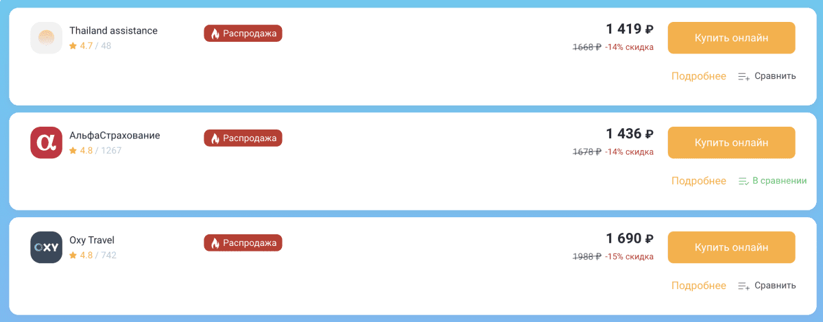 Также на платформе можно выбрать классические тайские страховки от Т-Страхования, АльфаСтрахования и других компаний, чтобы подобрать вариант под свой бюджет и реальные риски.