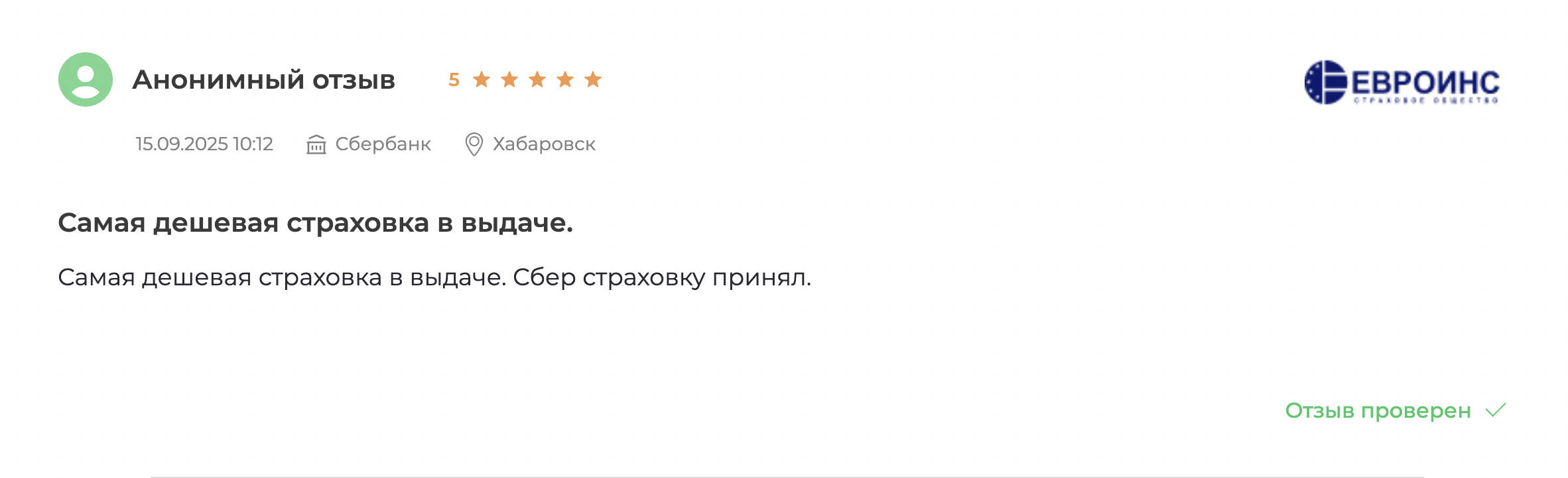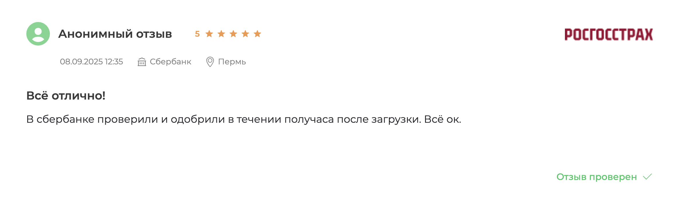 Анна, 34 года, Москва:«Первый полис оформила в Сбере, потом сравнила цены и в другой страховой оказалось дешевле почти на 6 000 ₽. Банк без проблем принял полис.»