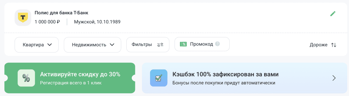 −30% на первую покупку — укажите имя и e-mail и получите доступ к эксклюзивным предложениям.Кешбэк 100% за ипотечную страховку — бонусы зачислим в личный кабинет в течение суток.
