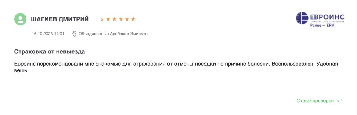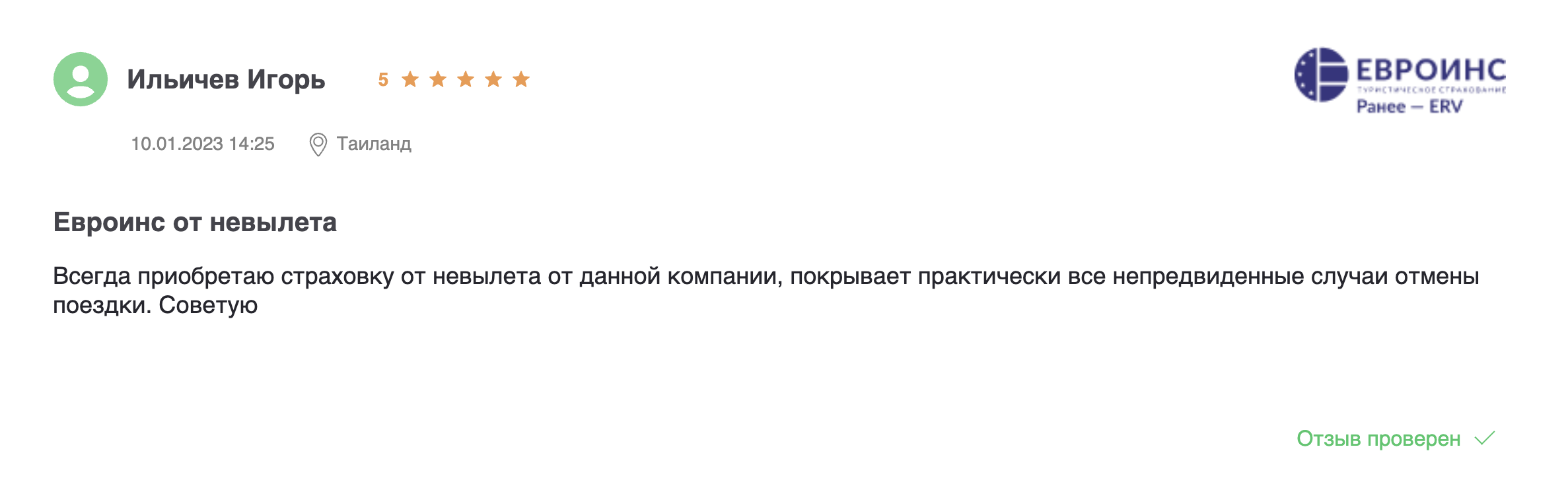 «Евроинс порекомендовали знакомые для страхования от отмены поездки по причине болезни. Воспользовался. Удобная вещь.»
