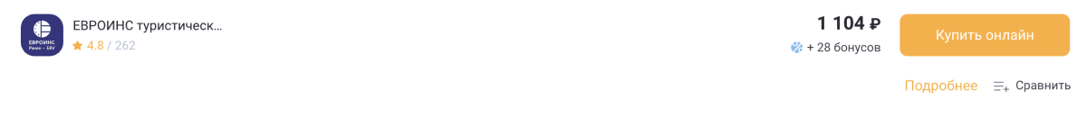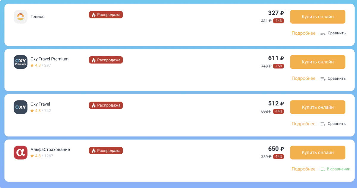 - Более 20 страховых компаний в одном месте (рекомендуем: Oxy Travel Premium, АльфаСтрахование, Евроинс);