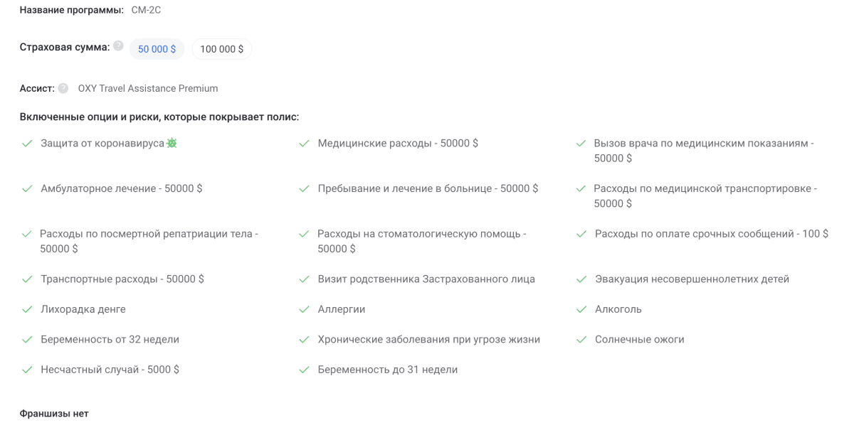 | Oxy Travel / СМ-1C | 1 690 ₽ (-15%) | 50 000 $ | OXY Travel Assistance | Медицинские расходы, вызов врача, амбулаторное лечение, пребывание в больнице, транспортировка, стоматология, визит родственника, эвакуация детей, аллергии, солнечные ожоги, беременность до 31 недели, алкоголь, хронические заболевания | нет | Купить онлайн |