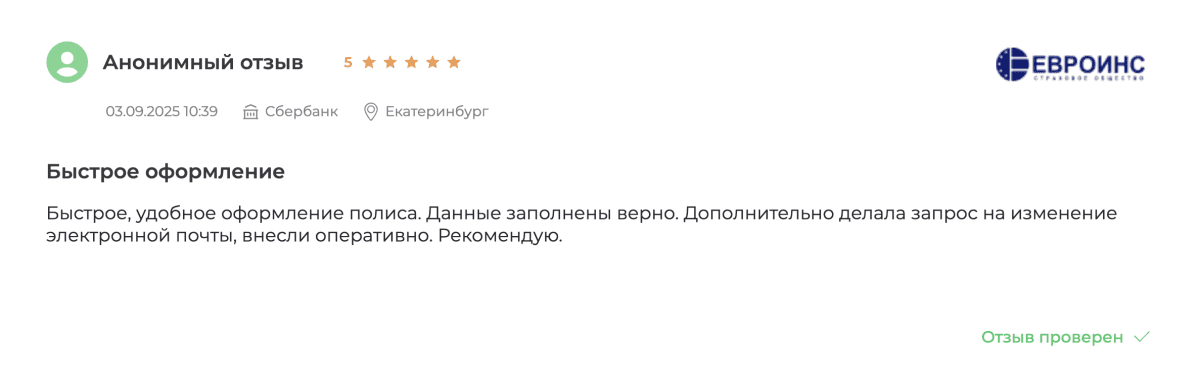 «Быстрое, удобное оформление полиса. Данные заполнены верно. Дополнительно делала запрос на изменение электронной почты — внесли оперативно. Рекомендую.»