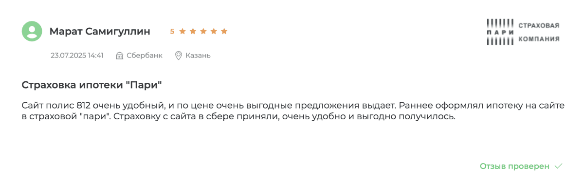 «Сайт Полис812 очень удобный, и по цене выдаёт очень выгодные предложения. Ранее оформлял ипотеку на сайте в страховой ПАРИ. Страховку с сайта в Сбербанке приняли, очень удобно и выгодно получилось.»