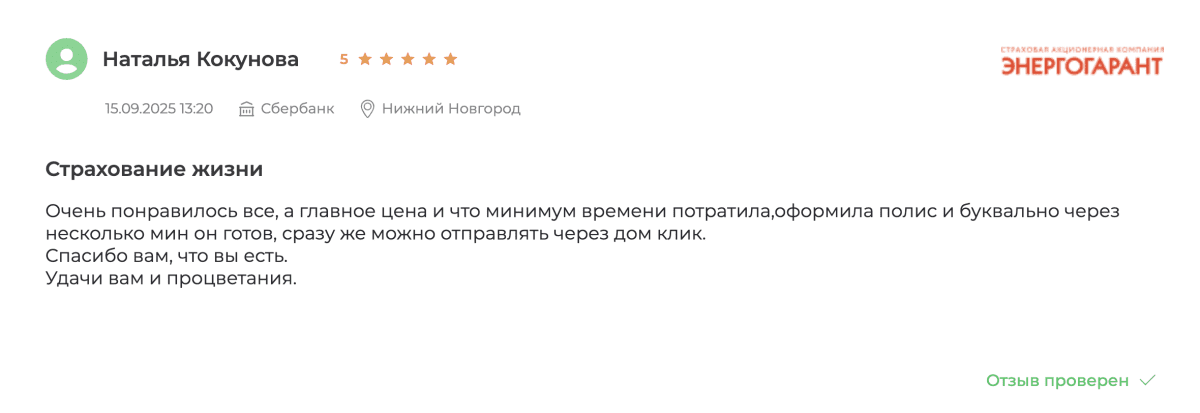 «Очень понравилось все, а главное цена и что минимум времени потратила: оформила полис и буквально через несколько минут он готов, сразу же можно отправлять через ДомКлик. Спасибо вам, что вы есть. Удачи вам и процветания.»