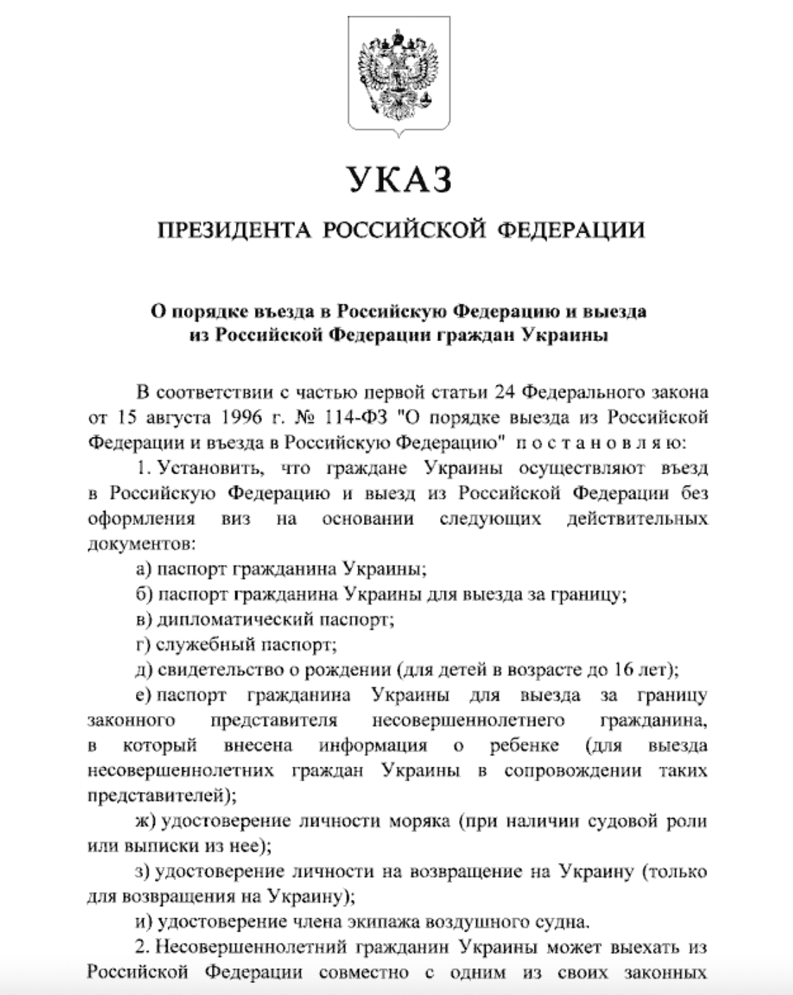 Президент РФ подписал указ, устанавливающий список удостоверений личности для въезда в Россию. Среди возможных вариантов указан внутренний паспорт гражданина Украины. Более того, пересекать российскую границу можно с документом, у которого истек срок годности.